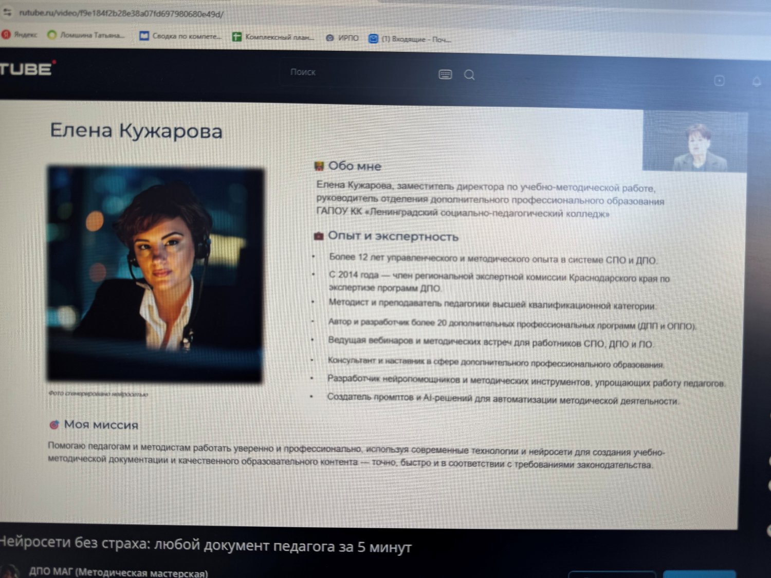 Как отмечает сама Елена Ивановна, моя миссия – помогать педагогам и методистам работать уверенно и профессионально, используя современные технологии и нейросети для создания учебно-методической документации и качественного образовательного контента – точно, быстро и в соответствии с требованиями законодательства.